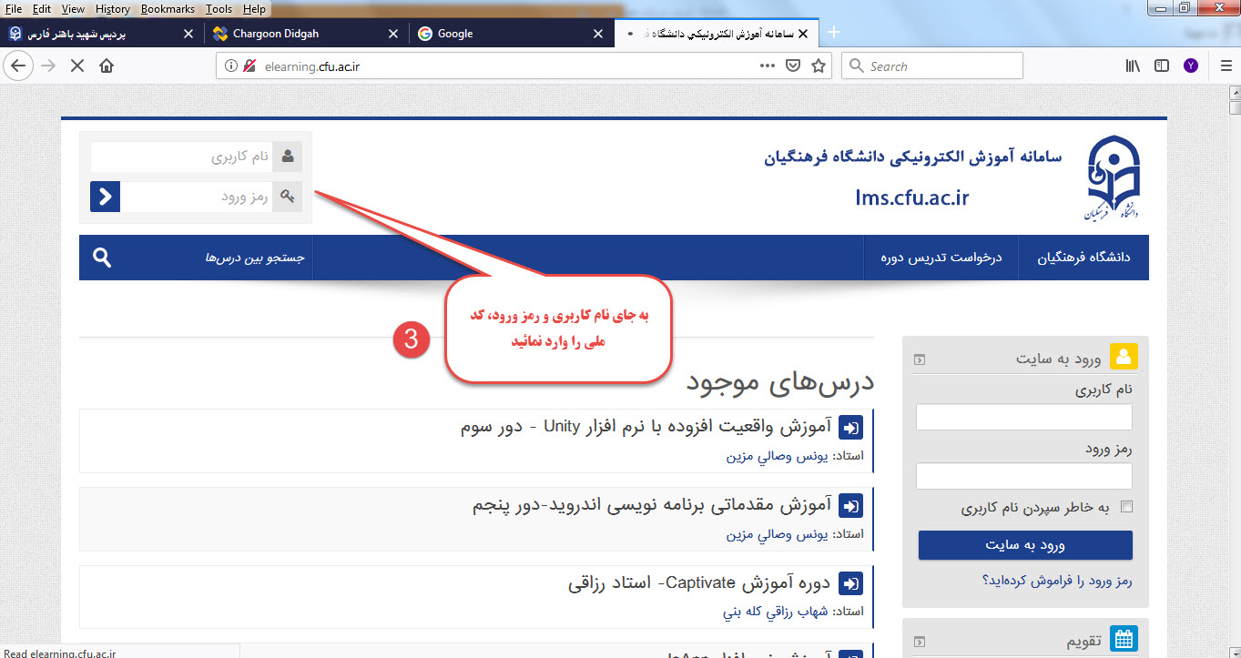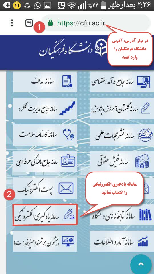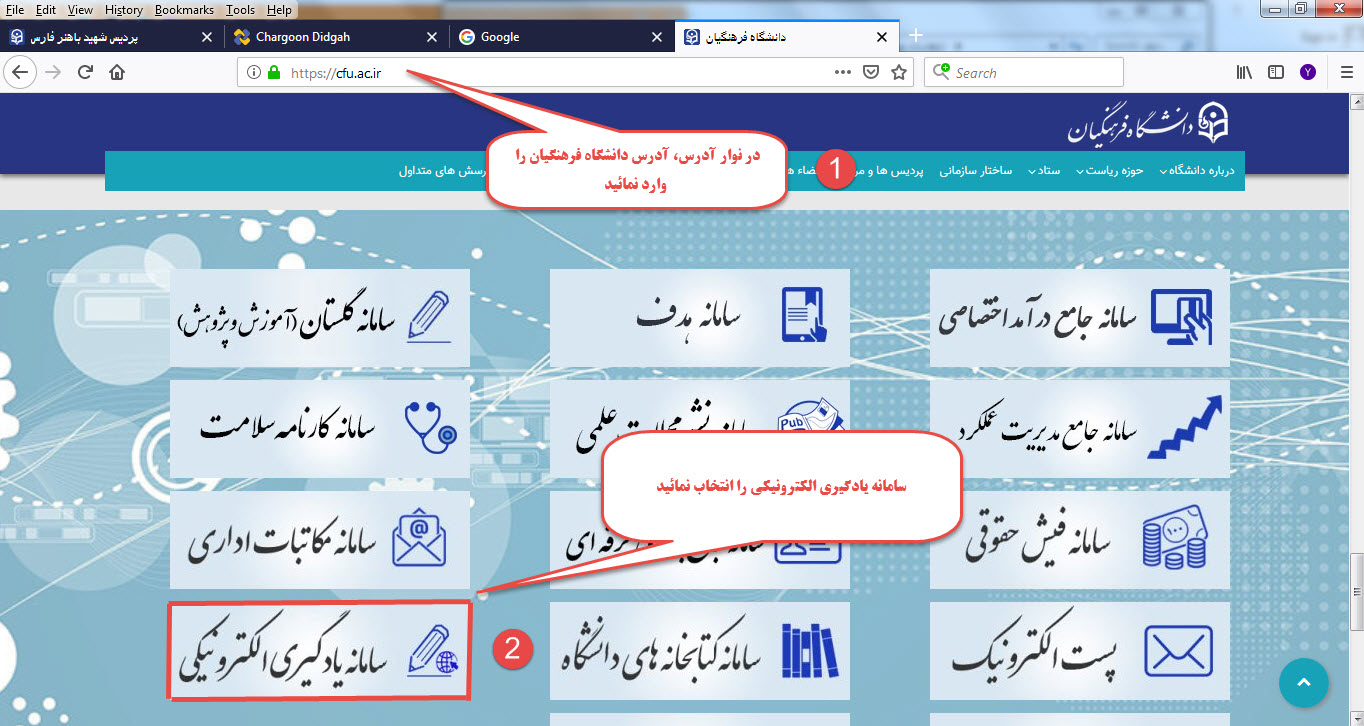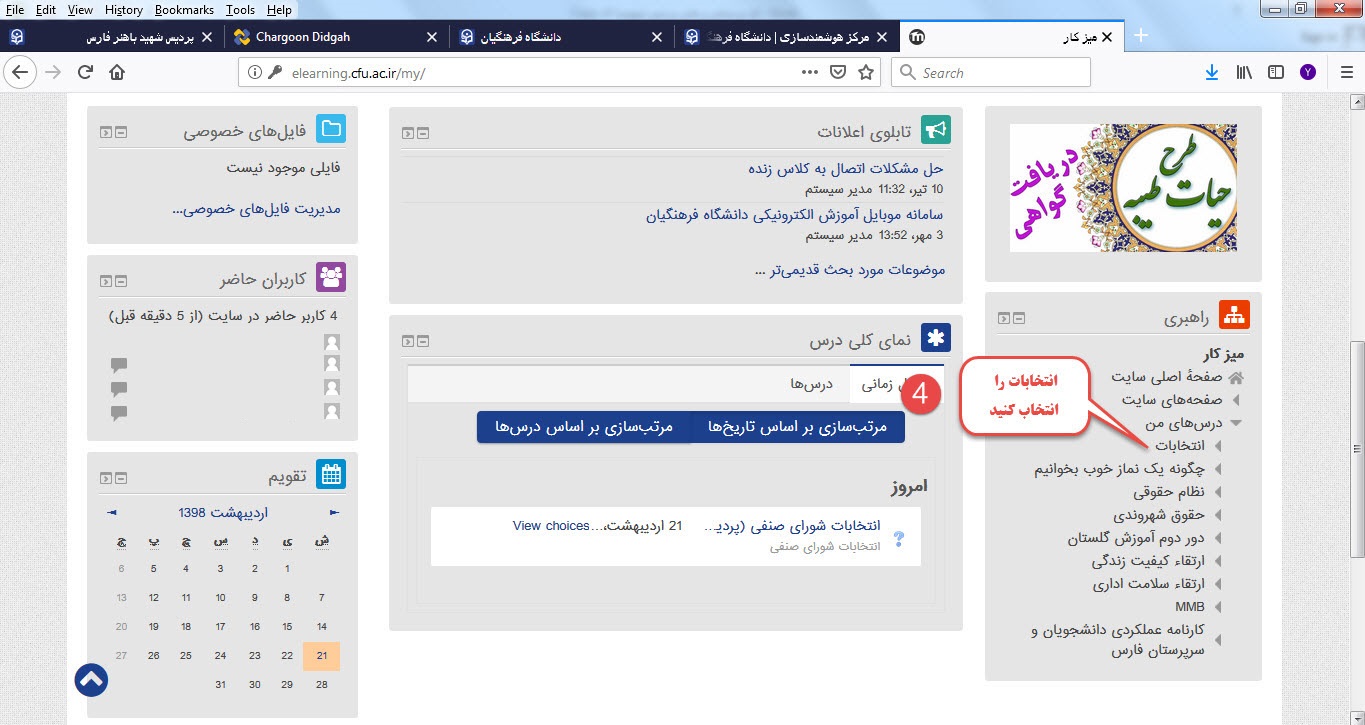 به اطلاع دانشجویان گرامی می رساند انتخابات شورای صنفی، روز سه شنبه 24 اردیبهشت از ساعت 8 الی 17 به صورت الکترونیکی و بر روی سامانه یادگیری الکترونیکی دانشگاه فرهنگیان به آدرس lms.cfu.ac.ir برگزار می گردد.