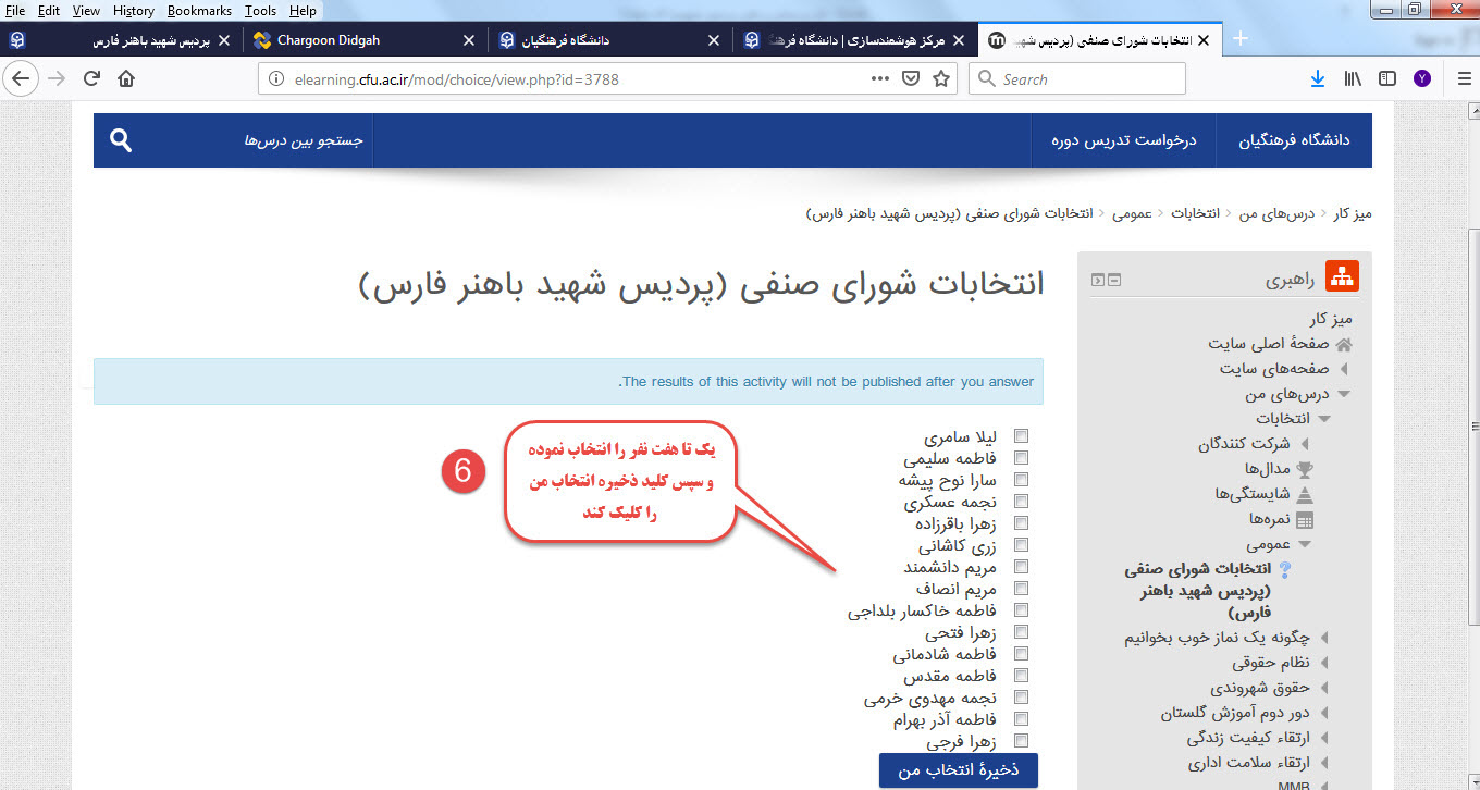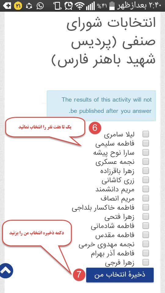 هر نفر می تواند از بین کاندیداها یک الی هفت نفر را انتخاب نماید. اسامی کاندیداها به شرح زیر می باشد: