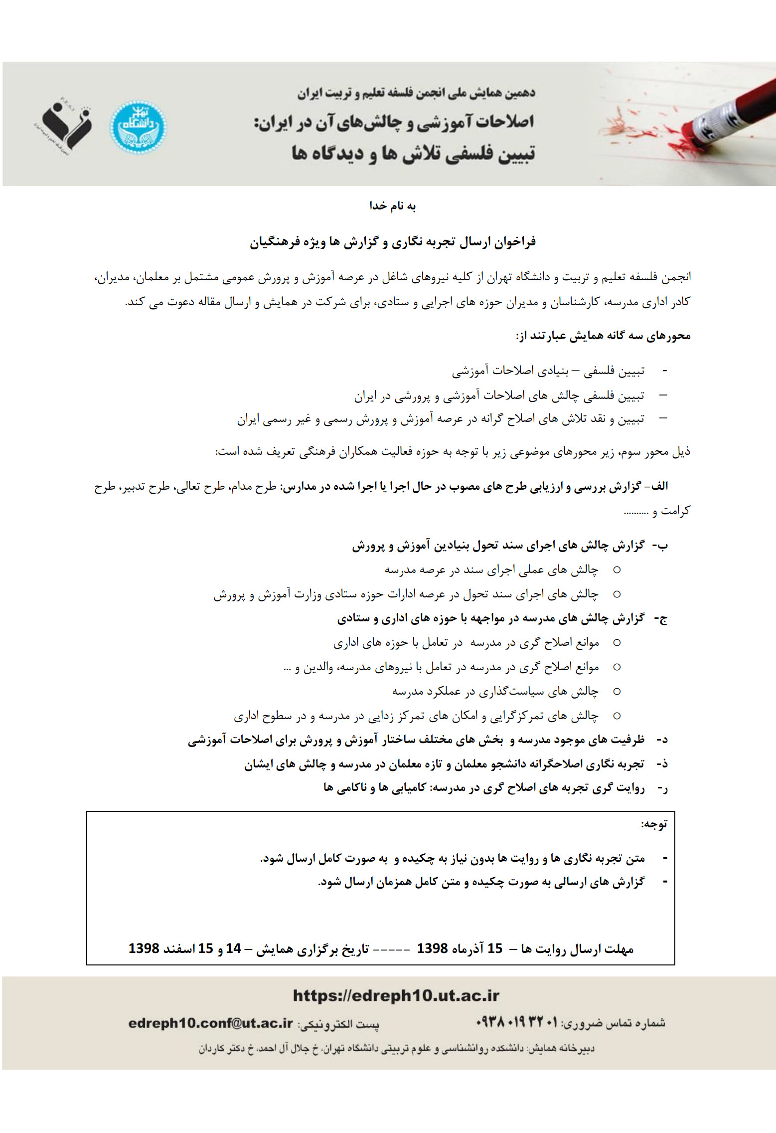 پیرو گفتگوهای انجام شده در کمیته آموزش و پرورش همایش و نظر به این که موضوع دهمین همایش انجمن فلسفه تعلیم و تربیت با عنوان " اصلاحات آموزشی و چالش های آن در ایران: تبیین فلسفی دیدگاه ها و تلاش ها "، با مسئولیت دانشگاه تهران، در ارتباط مستقیم با فعالیت ها و مسئولیت های سطوح مختلف وزارت آموزش و پرورش است، جهت غنای علمی همایش و تعامل موثر در تحقق هدف های همایش که به جز از طریق مشارکت کارشناسان وزارتخانه، ادارات تابعه و نیروهای مدارس، با توجه به تلاش های و تجربیات ایشان میسر نخواهد بود، دبیرخانه همایش با ارائه محورهای موضوعی ویژه فرهنگیان، از کارشناسان و همکاران سطوح مختلف وزارت آموزش و پرورش برای ارسال گزارش ها و روایتگری تجربیات در حوزه فعالیت شان دعوت می کند.