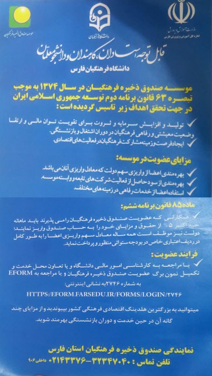 نحوه عضو گیری: الف) همکاران : کسانی که عضو هستند می توانند با مراجعه به امور مالی مقدار موجودی خود را افزایش دهند. ب) دانشجویان به دو روش می توانند عضو گردند: 1- به امور مالی پردیس مراجعه و فرم عضویت را تکمیل نمایند. 2- با مراجعه به سامانه که آدرس آن در پوستر هست، فرم را تکمیل و مراحل ثبت نام را انجام دهند و کد رهگیری را به امور مالی پردیس، تحویل دهند. * فرم های مربوطه و اطلاعات بیشتر را می توانید از فایل های ضمیمه دریافت نمائید.