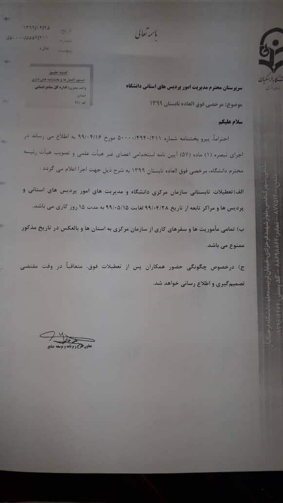 به اطلاع می رساند بنا به مصوبه سازمان مرکزی دانشگاه فرهنگیان، پردیس شهید باهنر فارس از تاریخ 28 تیر 99 لغایت 15 مرداد 99 تعطیل است و پاسخگوی مراجعین محترم نمی باشد.