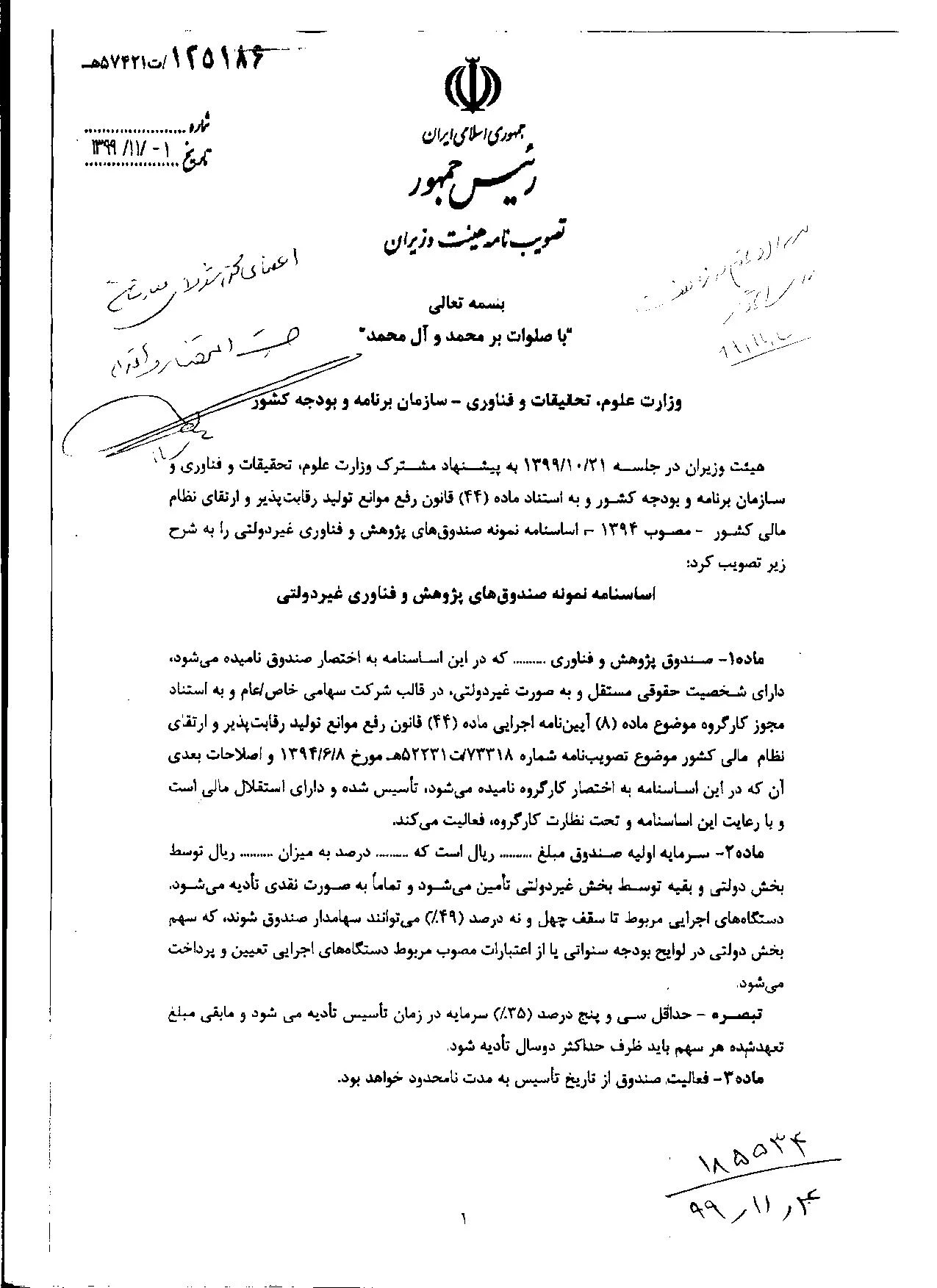 " تصویب نامه هیات وزیران درخصوص اساسنامه نمونه صندوق های پژوهش و فناوری غیردولتی" 3