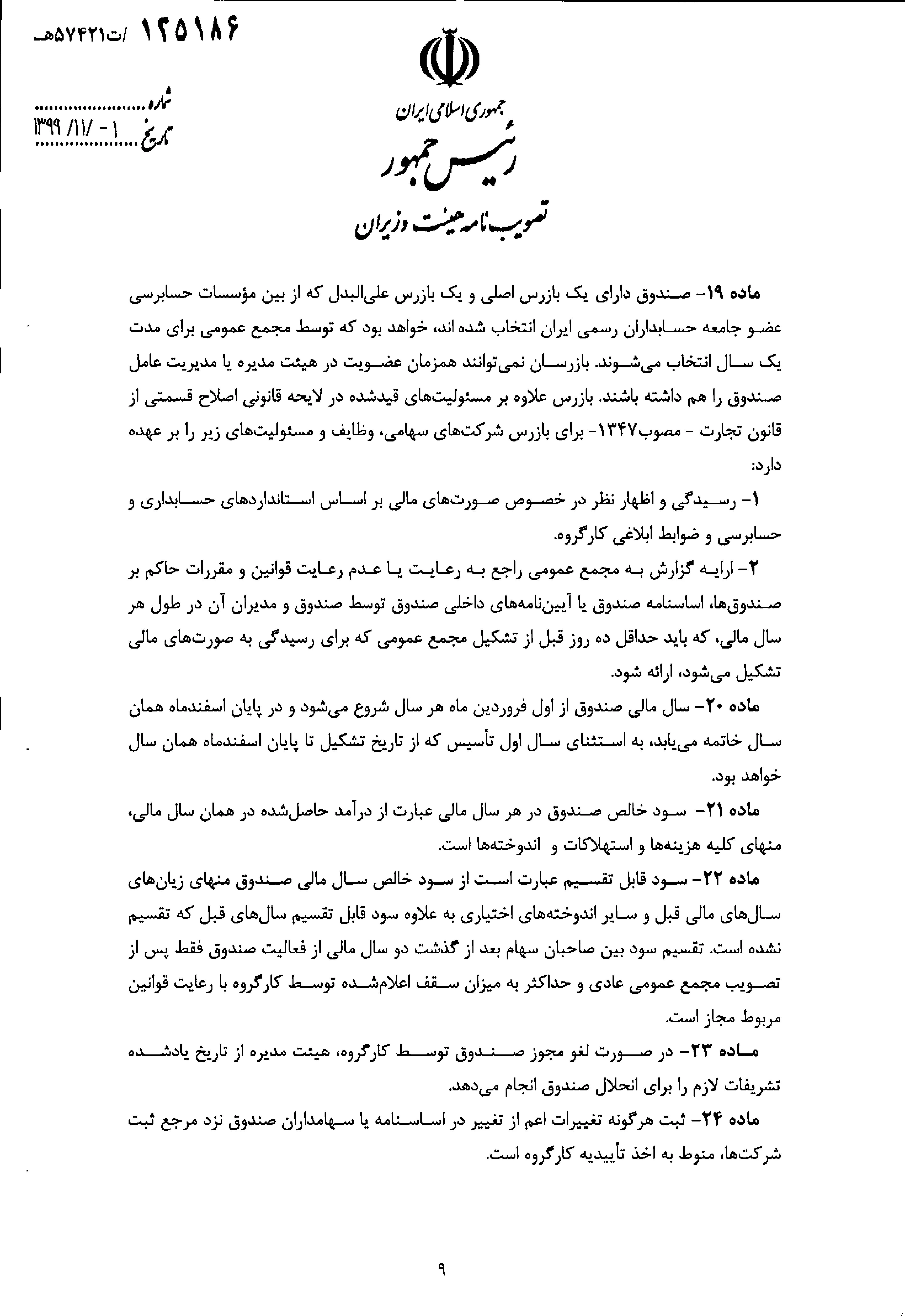 " تصویب نامه هیات وزیران درخصوص اساسنامه نمونه صندوق های پژوهش و فناوری غیردولتی" 9