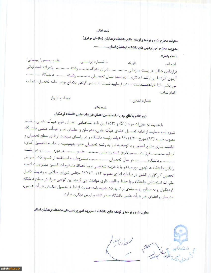 کاربرگ اعلام بلامانع بودن ادامه تحصیل اعضای هیئت علمی و غیر هیئت علمی