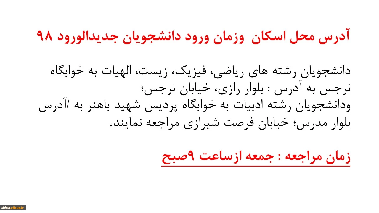 ادرس محل اسکان وزمان ورود دانشجویان جدیدالورود98