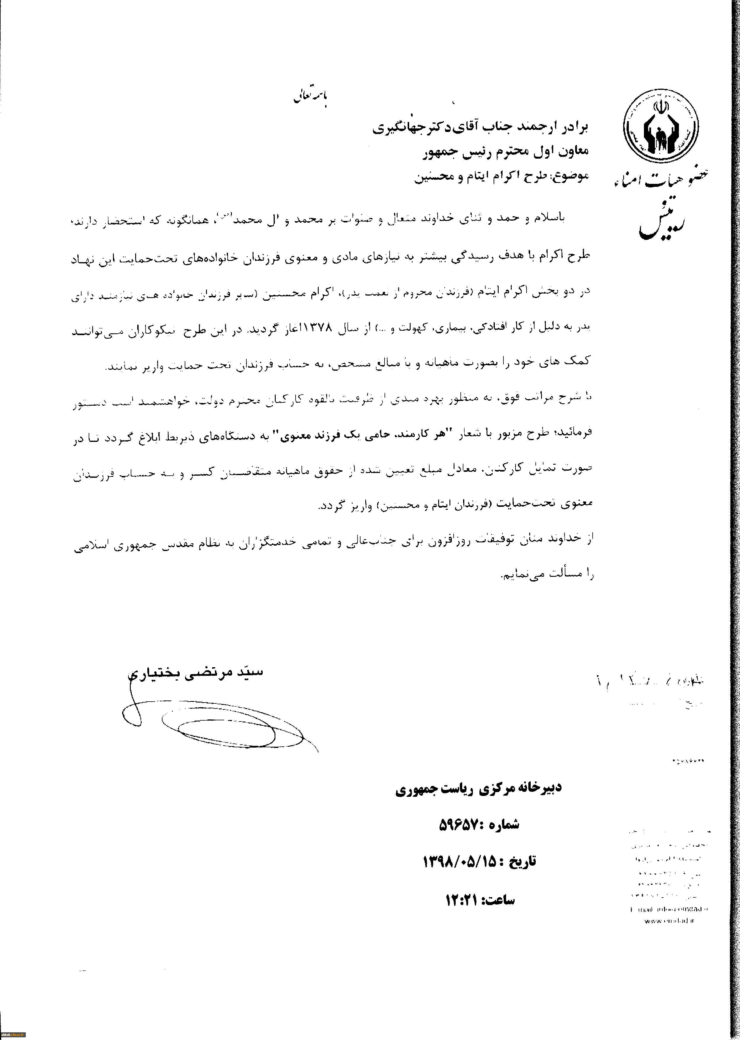 امتیاز دهید : درخصوص"ارائه طرح اکرام ایتام ومحسنین با موضوع "هرکارمند،حامی یک فرزندمعنوی" 2 دوشنبه 15 مهر 1398 ساعت 8:57