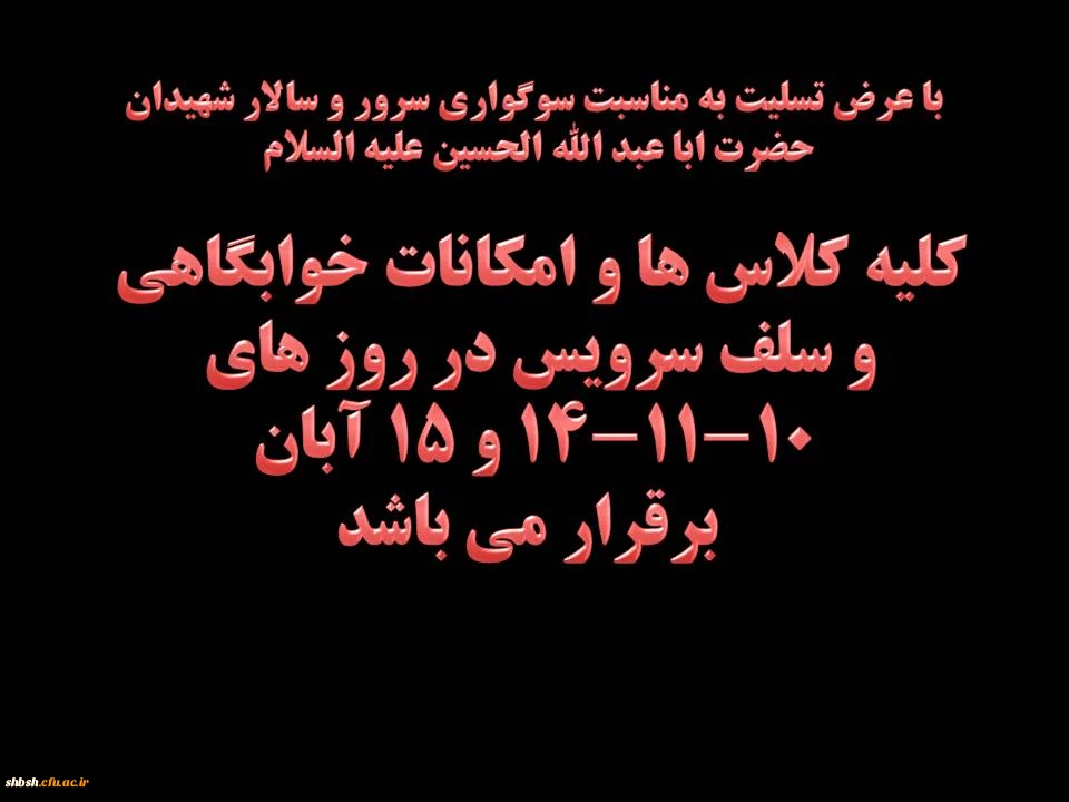 امتیاز دهید : کلیه کلاس و امکانات خوابگاهی و سلف سرویس در روز های 10-11-14 و 15 آبان برقرار می باشد چهارشنبه 7 آبان 1393 ساعت 11:45