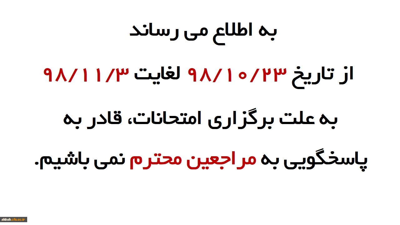 به اطلاع می رساند از تاریخ 98/10/23 لغایت 98/11/3 به علت برگزاری امتحانات، قادر به پاسخگویی به مراجعین محترم نمی باشیم. 2