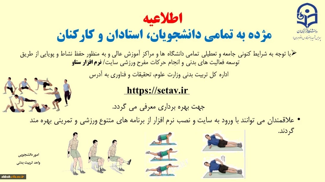 امتیاز دهید : معرفی" نرم افراز ورزشی ستاو "جهت استفاده دانشجومعلمان و اعضاء هیات علمی و غیر هیات علمی 2 یکشنبه 7 اردیبهشت 1399 ساعت 9:15