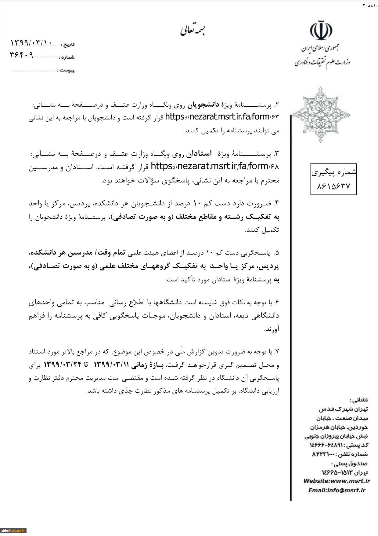 تکمیل پرسشنامه توسط اساتید و دانشجویان به منظور رصد فعالیتها و ارزیابی عملکرد دانشگاهها و موسسات آموزش عالی در ارائه آموزشهای غیر حضوری در وضعیت همه گیری بیماری کووید 19 3