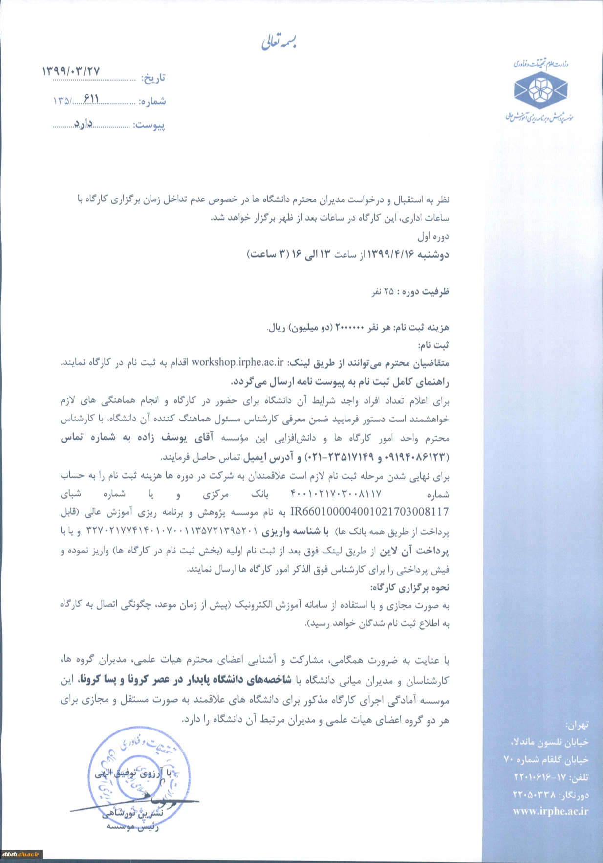 برگزاری کارگاه شاخصه های دانشگاه پایدار در عصر کرونا و پسا کرونا در 16 تیر ماه + نحوه ثبت نام با شماره نامه 49355 2