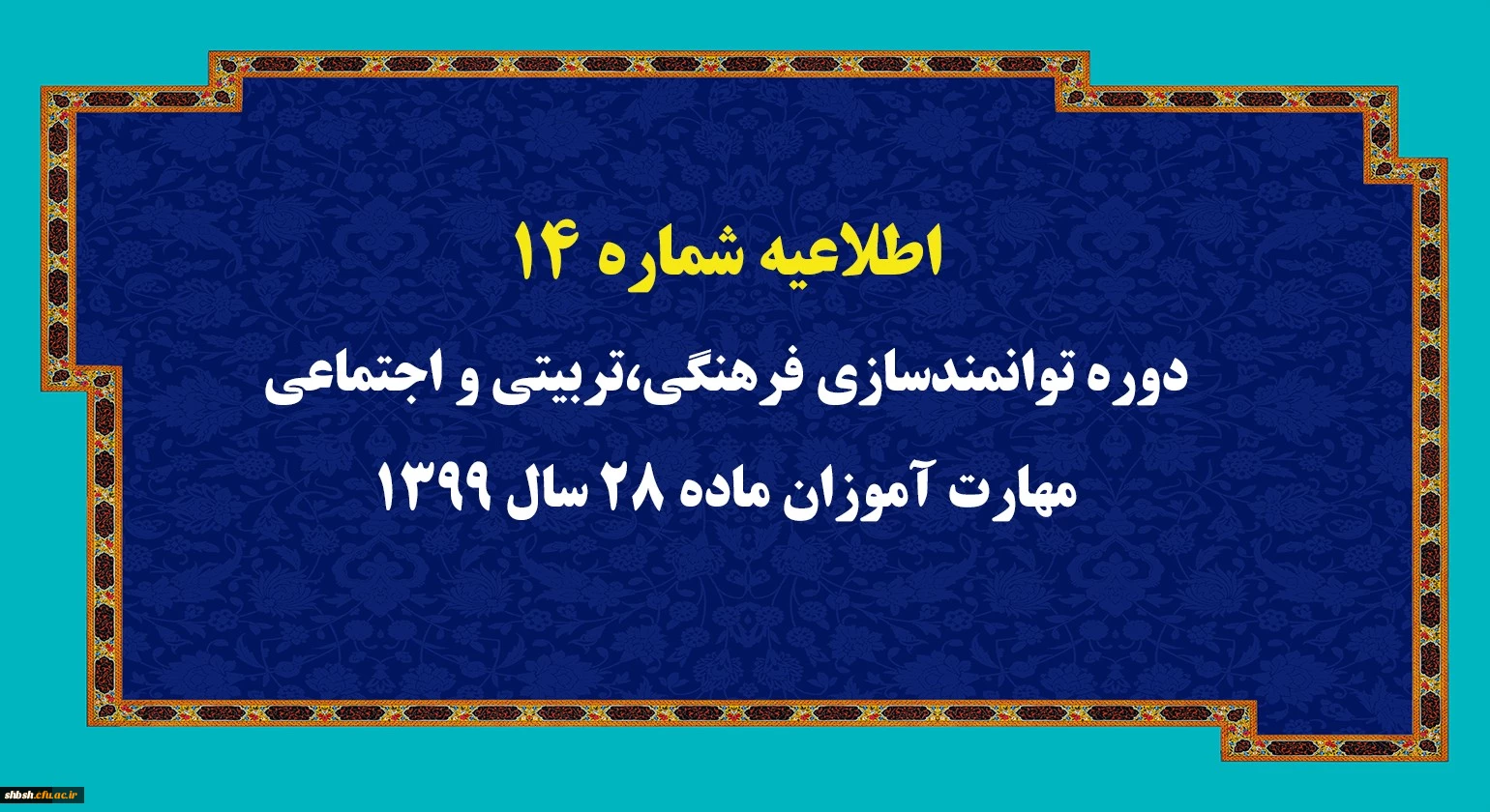 امتیاز دهید : اطلاعیه شماره 14 دوره توانمندسازی فرهنگی،تربیتی و اجتماعی مهارت آموزان ماده 28 سال 1399 2 پنجشنبه 2 مرداد 1399 ساعت 12:37