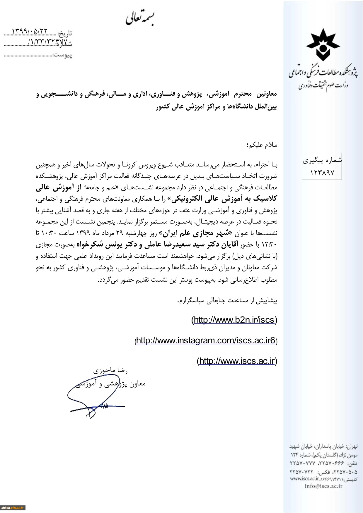 امتیاز دهید : فراخوان مجموعه نشست های علم و جامعه؛ از آموزش عالی کلاسیک به آموزش عالی الکترونیکی 2 یکشنبه 2 شهریور 1399 ساعت 10:57