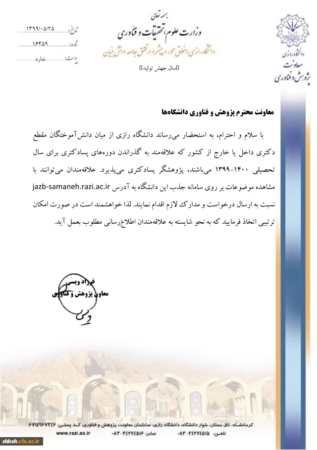 فراخوان پذیرش پژوهشگر پسادکتری در دانشگاه رازی 2
