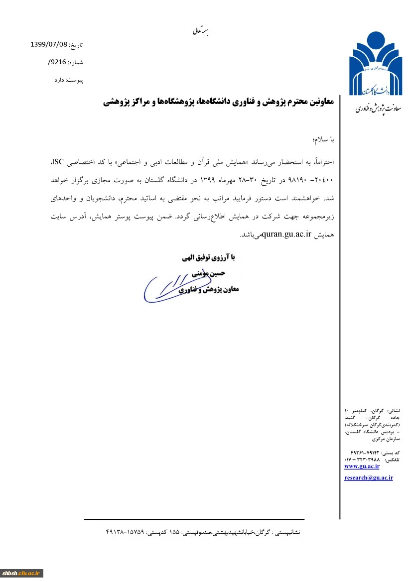 امتیاز دهید : فراخوان همایش ملی قرآن و مطالعات ادبی و اجتماعی در دانشگاه گلستان با شماره نامه 140332 2 سهشنبه 6 آبان 1399 ساعت 7:53