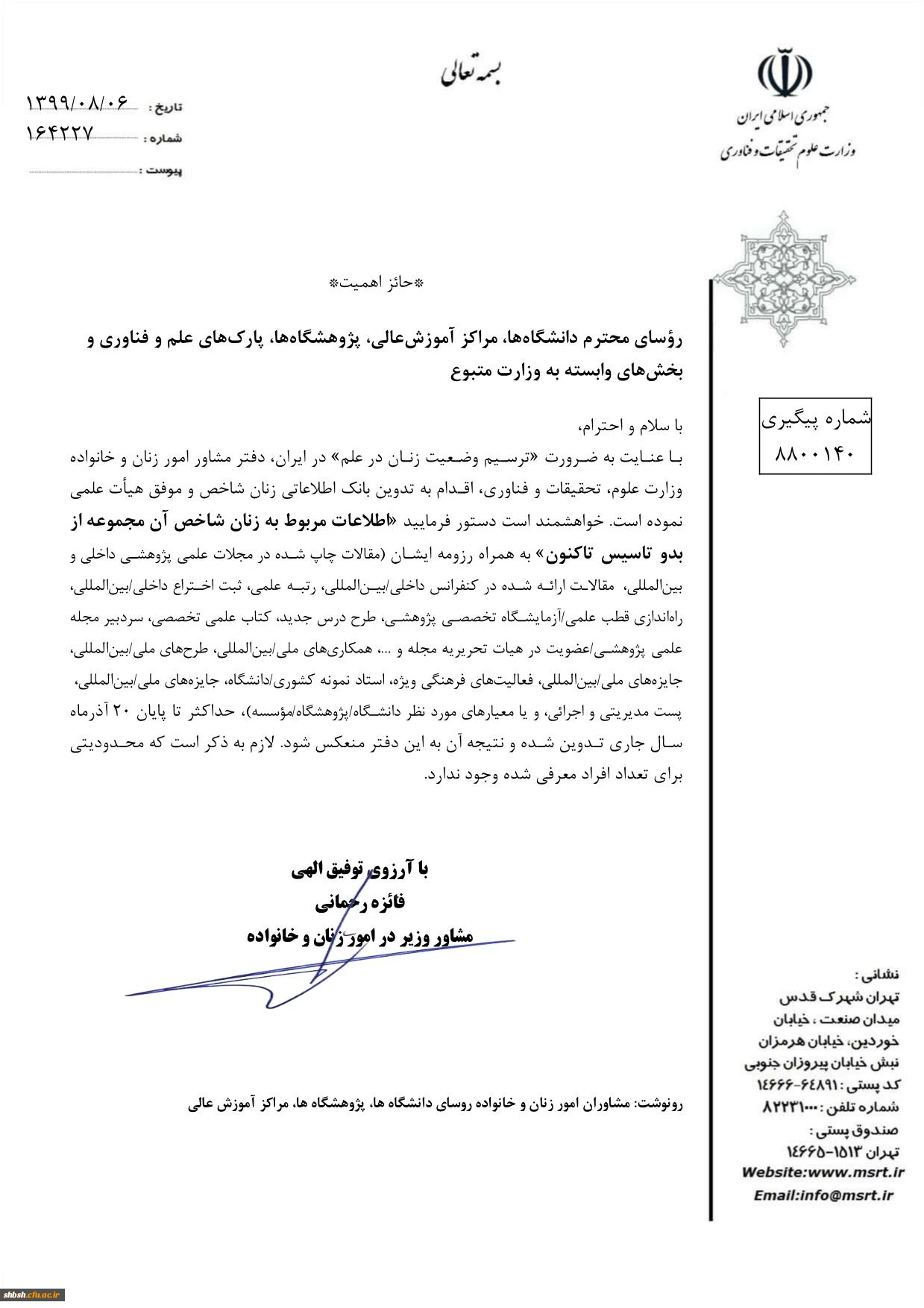 امتیاز دهید : عطف به ارسال اطلاعات زنان شاخص دانشگاه ها با شماره نامه 164227 2 یکشنبه 18 آبان 1399 ساعت 12:28