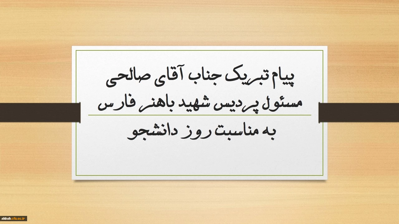 امتیاز دهید : پیام تبریک جناب آقای صالحی مسئول پردیس شهید باهنر فارس به مناسبت روز دانشجو 2 یکشنبه 16 آذر 1399 ساعت 12:49