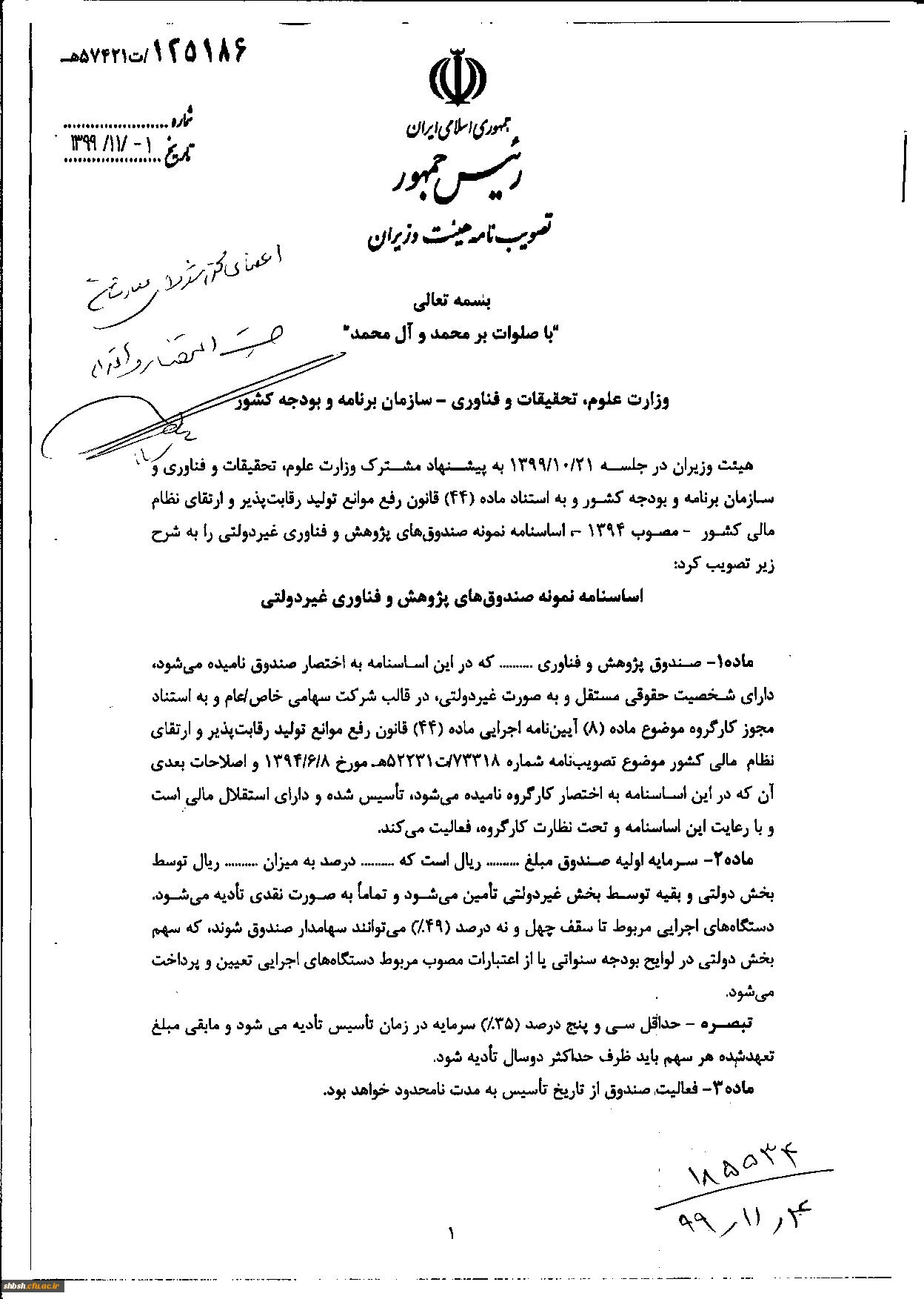 امتیاز دهید : " تصویب نامه هیات وزیران درخصوص اساسنامه نمونه صندوق های پژوهش و فناوری غیردولتی" 3 چهارشنبه 29 بهمن 1399 ساعت 9:51