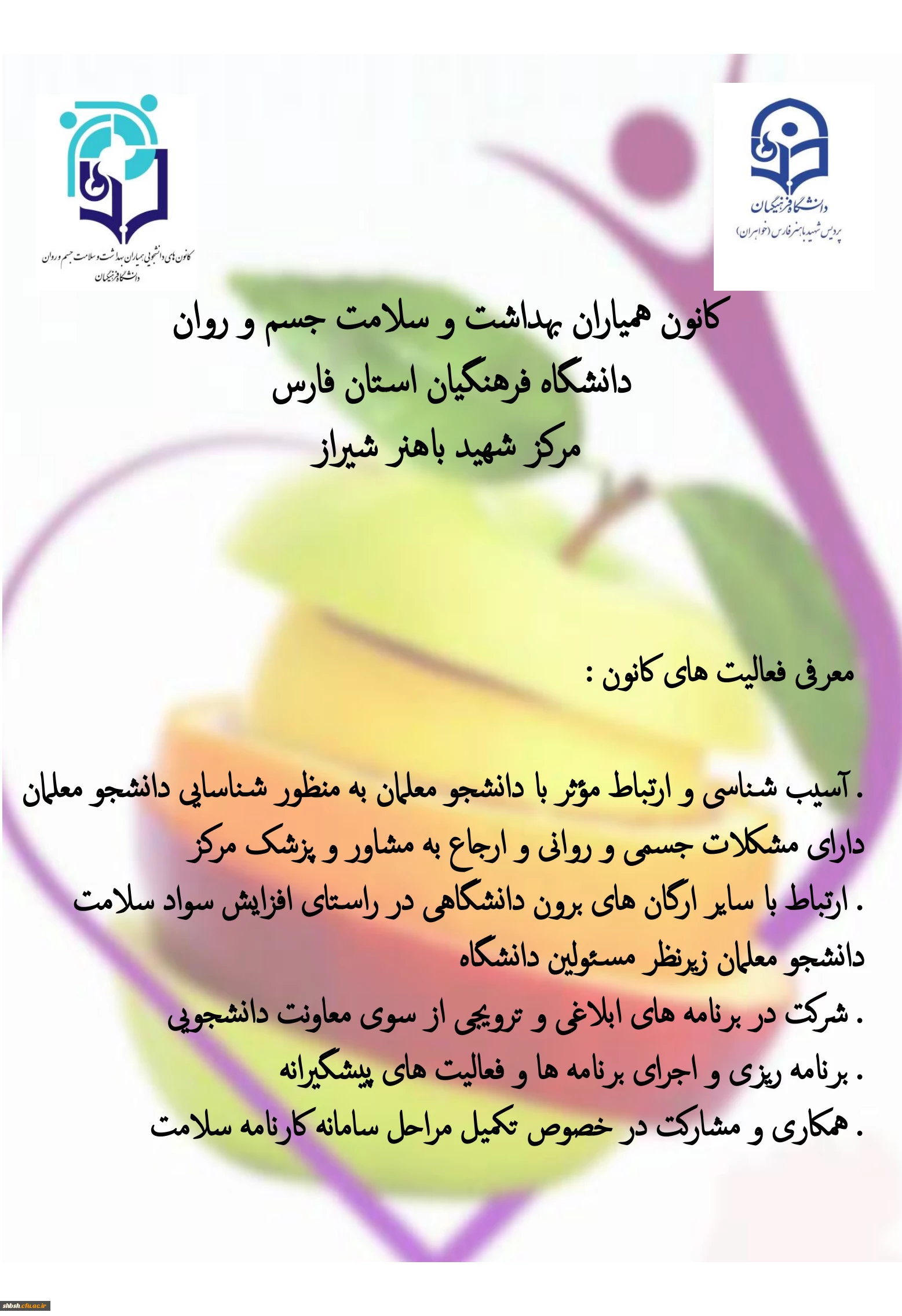 امتیاز دهید : معرفی اعضا و فعالیت های کانون همیاران بهداشت و سلامت جسم و روان 3 چهارشنبه 13 بهمن 1400 ساعت 8:15