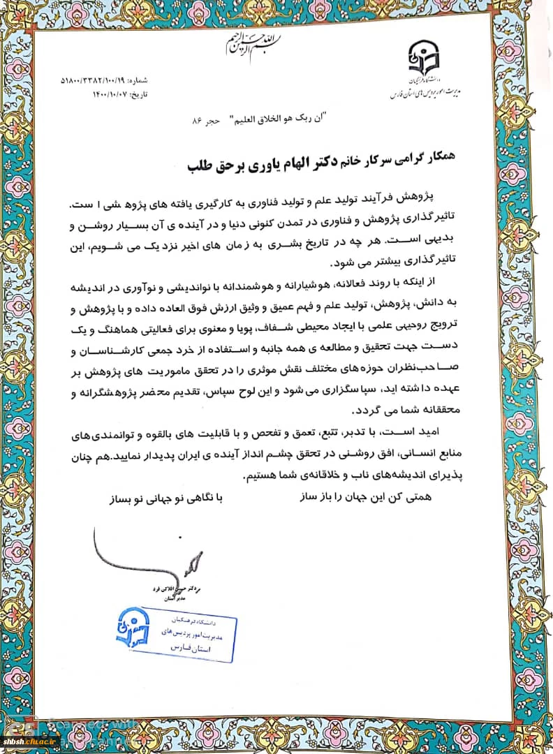 افتخارات پژوهشی پردیس شهید باهنر شیراز در سال 1400 6