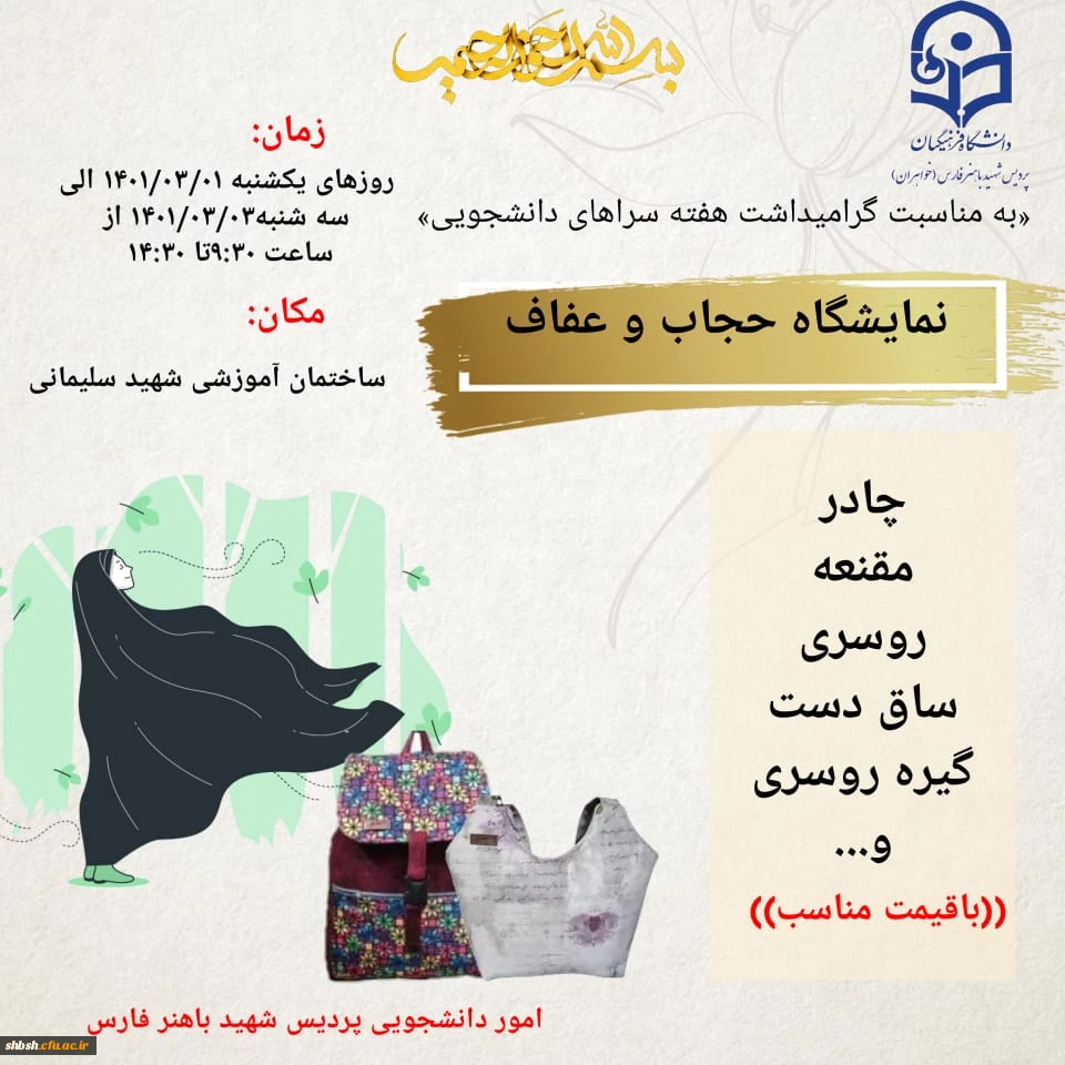 امتیاز دهید : برگزاری نمایشگاه حجاب و عفاف به مناسبت گرامی داشت هفته سراهای دانشجویی 6 چهارشنبه 4 خرداد 1401 ساعت 10:23