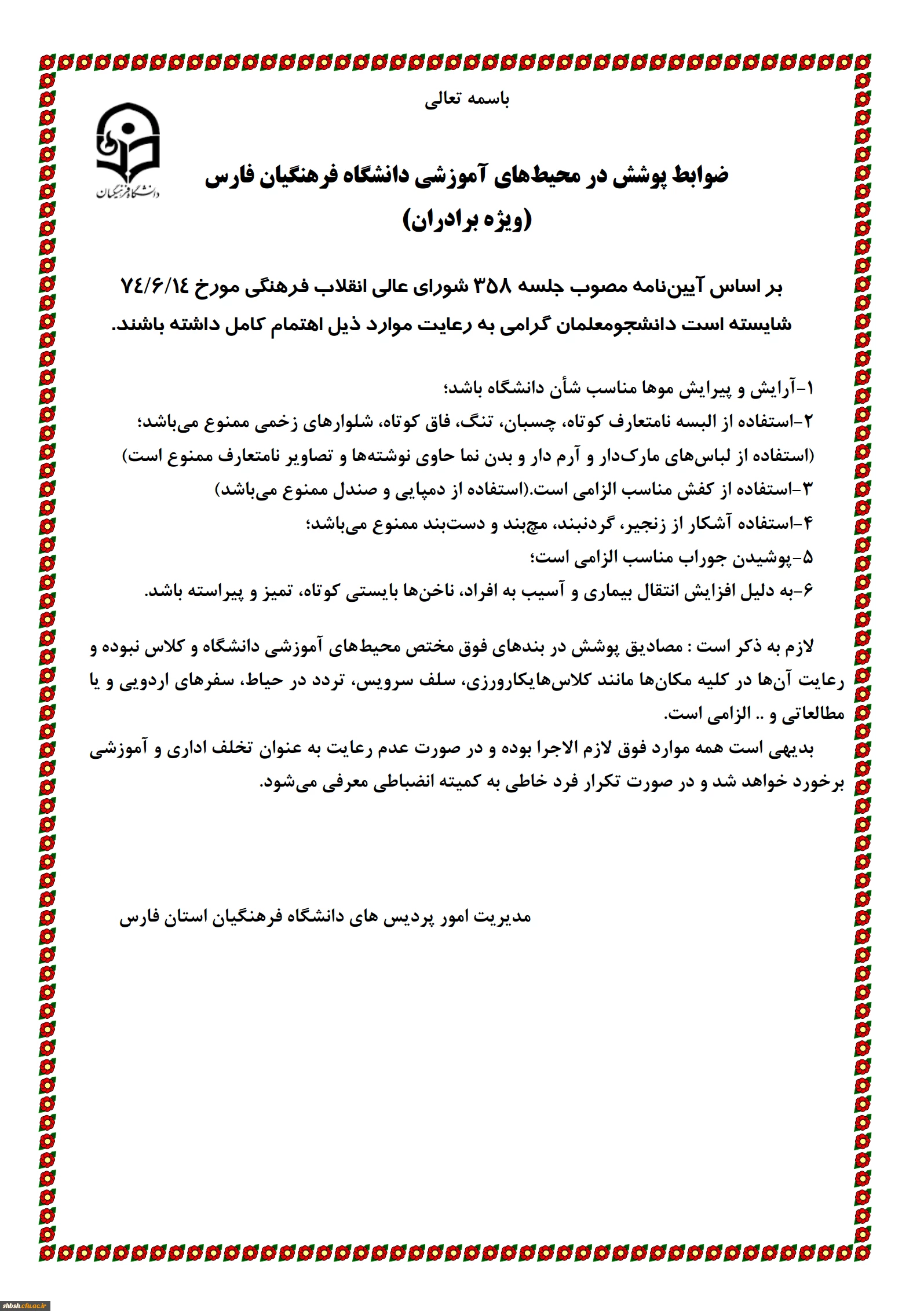 امتیاز دهید : ضوابط پوشش در محیط های آموزشی دانشگاه فرهنگیان فارس(ویژه دانشجویان) 3 یکشنبه 8 خرداد 1401 ساعت 10:57